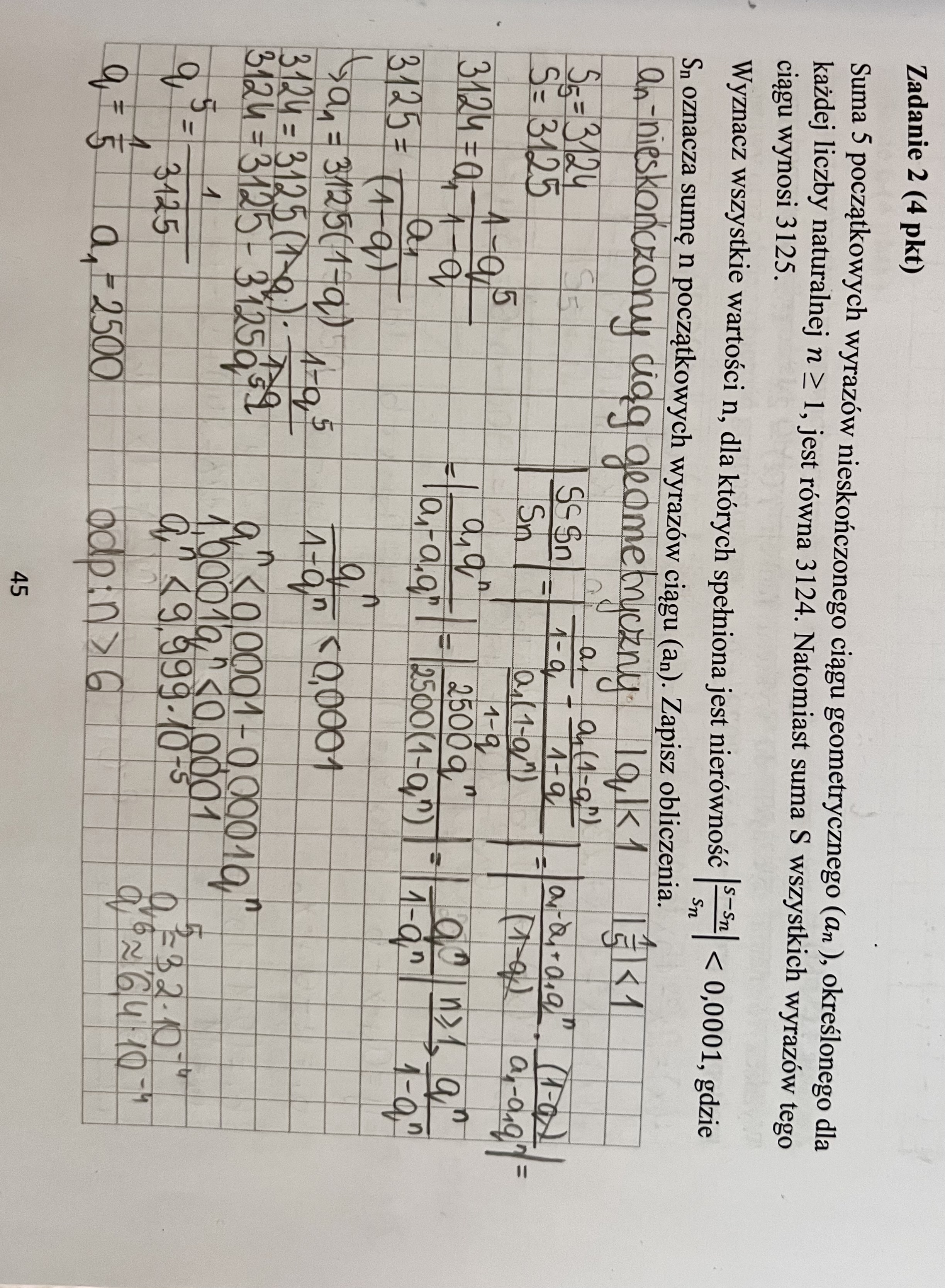 Suma 5 początkowych wyrazów nieskończonego ciagu geometrycznego (an), określonego dla każdej liczby naturalnej n ≥ 1, jest równa 3124. Natomiast suma S wszystkich wyrazów tego ciagu wynosi 3125.Wyznacz wszystkie wartości n, dla których spełniona jest nierówność |(S-Sn)/Sn| < 0,0001, gdzie Sn oznacza sumę n początkowych wyrazów ciagu (an). Zapisz obliczenia.