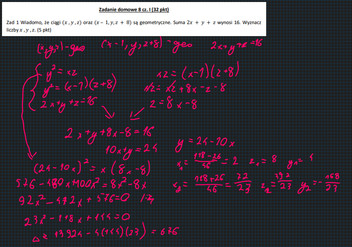 Wiadomo że ciągi (x, y, z) oraz (x - 1 y x + 8) są geometryczne. Suma 2x + y + z wynosi 16. Wyznacz liczby x, y, z