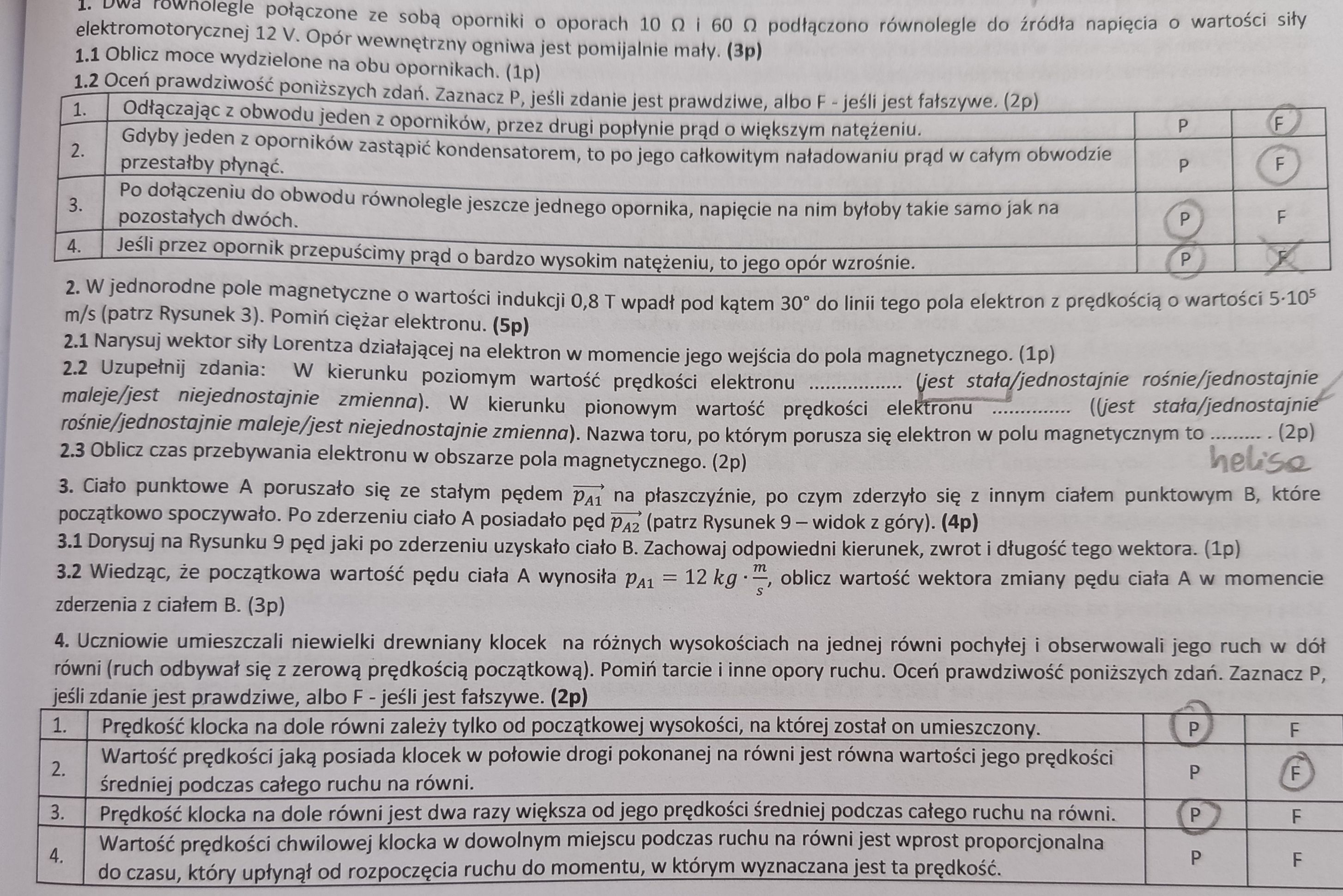 Chciałam także dopytać, czy dobrze to rozumiem: w zadaniu 2 z cz.2 jak elektron będzie poruszać się po linii śrubowej, to siła Lorenza będzie pełnić rolę siły dośrodkowej i poprzez działanie tylko na pionową składową prędkości (bo w poziomie v jest równoległe do B i siła Lorenza będzie tu równa 0) będzie powodować ruch po okręgu w płaszczyźnie pionowej. W ruchu po okręgu prędkość liniowa jest zawsze styczna do toru ruchu, więc wektor początkowej prędkości pionowej będzie się zmieniał i rozbijał znowu na składową poziomą i pionową, a że między składowymi z trójkątów prostokątnych można wywnioskować zależności trygonometryczne, to będzie prędkość w kierunku pionowym zmieniać się niejednostajnie.