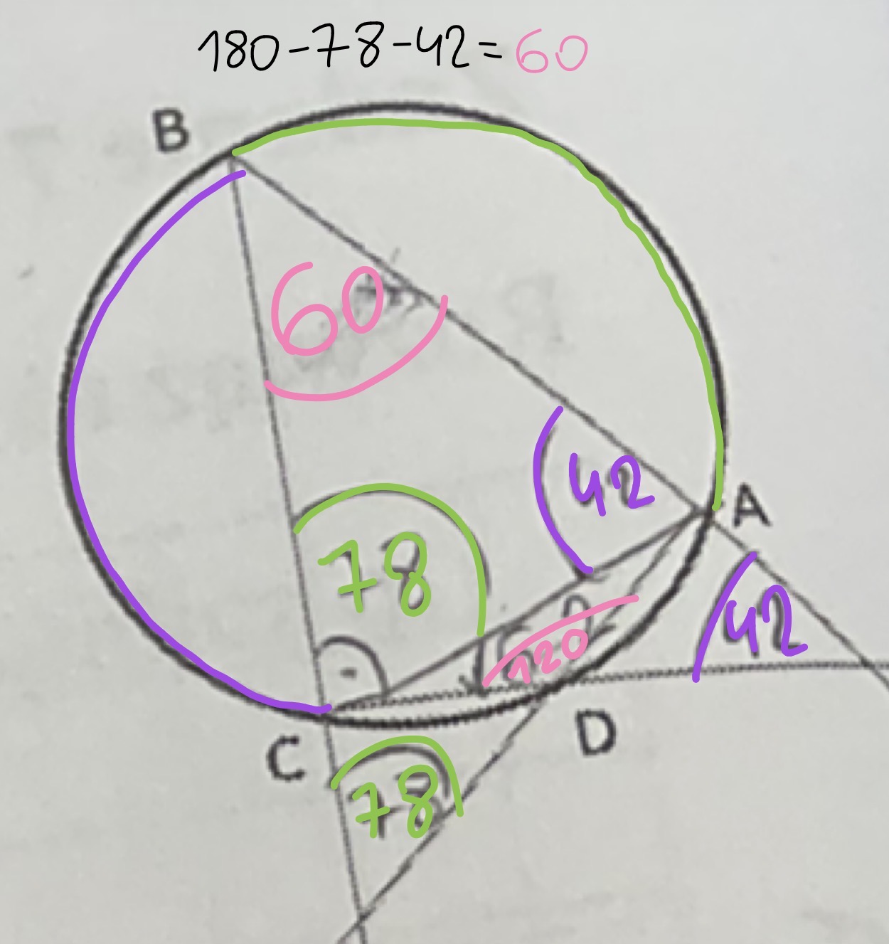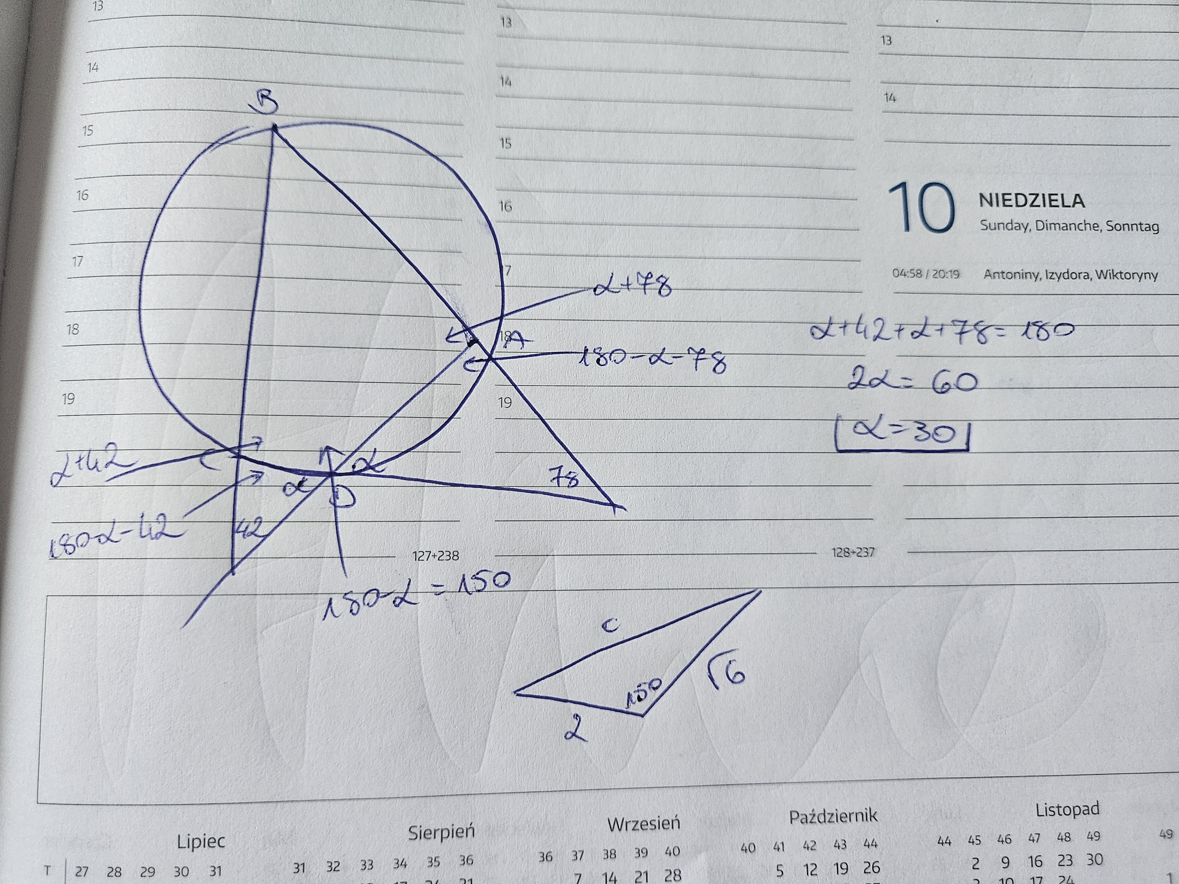 W odpowiedziach jest dobry wynik, twoj sposob jest zly. Nie mozesz skorzystac w taki sposob z kątow opartych na tym samym łuku, bo do tego punkty przecięcia musialyby nalezec do okregu. Sprobuj w taki sposob jak na zdjeciu przeanalizowac katy, nastepnie z tw cosinusow wyliczyc AC i bedziesz mogla z tw sinusow obliczyc promien