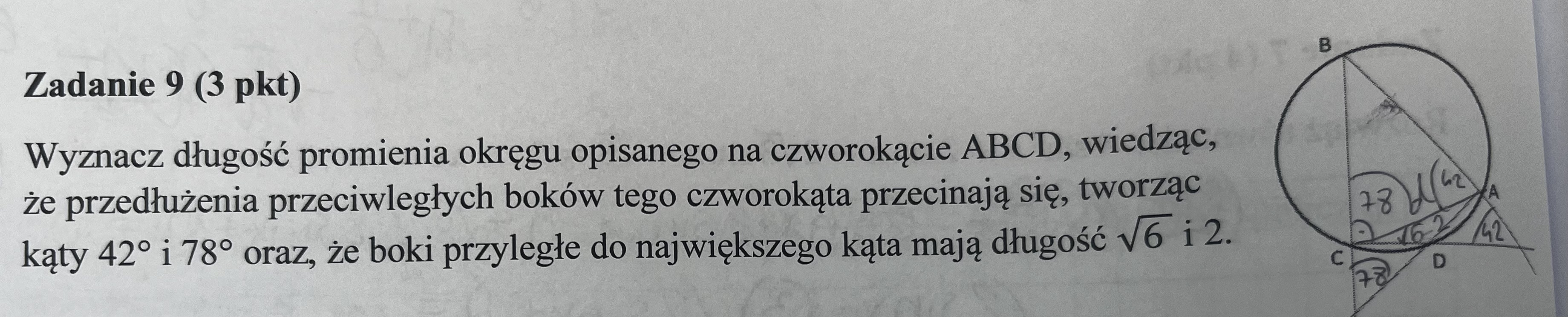 z analizy kątowej wychodzi mi w ten sposób. nie ma znaczenia gdzie bedzie 78 i 42 bo w trojkacie wyjdzie to samo - 60 stopni, a najwiekszy kąt czworokąta jest wtedy rowny 120 (potem dalej z tw cos i z tw sin R)
