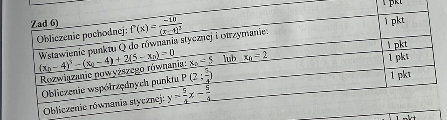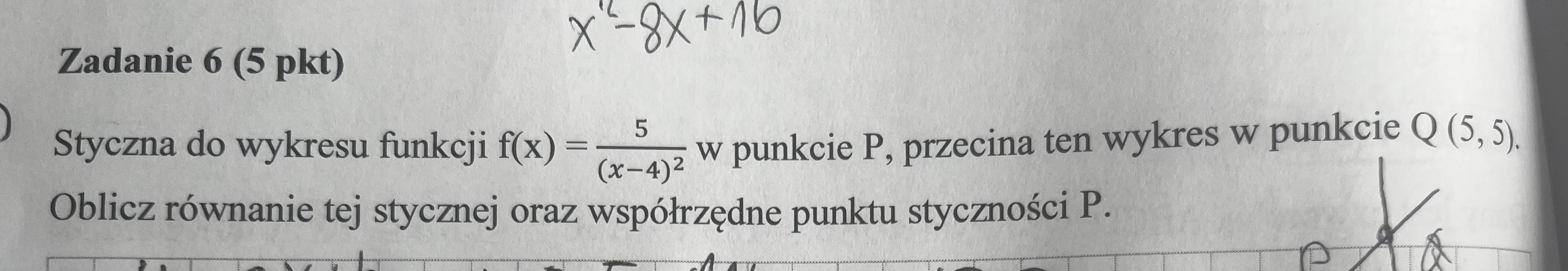 tutaj po rozwiazaniu rownania wychodzi x0=5, i rozumiem że odrzucamy je poniewaz ten punkt (5,5) jest punktem przeciecia a nie stycznosci. ale to skoro tak jest to dlaczego nam tutaj sie pojawilo x=5 jako rozwiazanie?