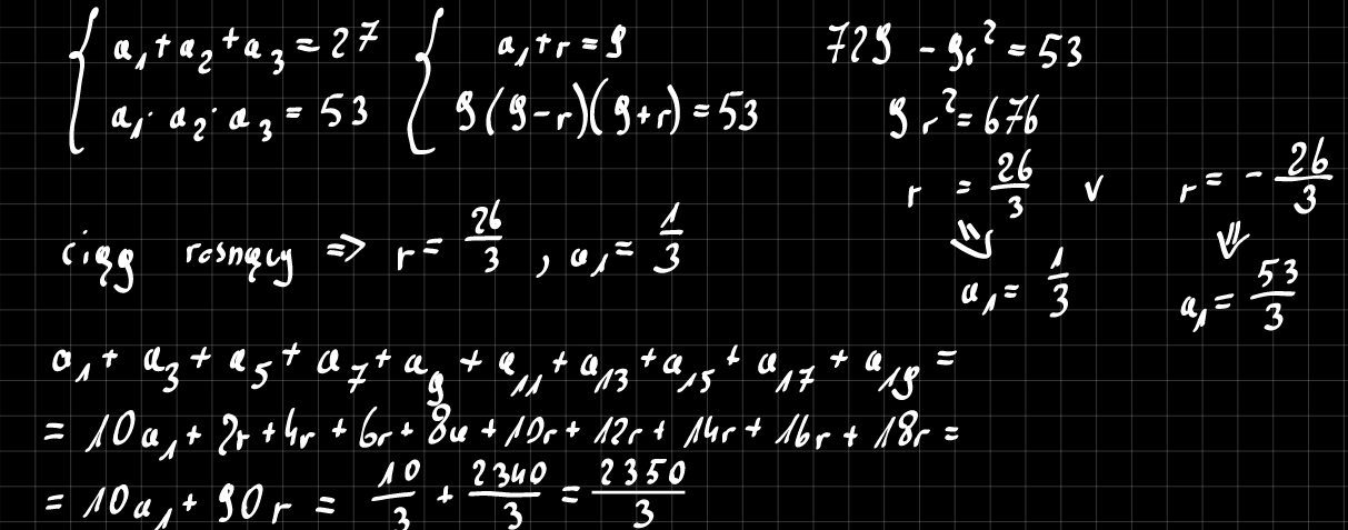 Dany jest rosnący ciąg arytmetyczny, którego suma trzech kolejnych liczb jest równa 27, a ich iloczyn wynosi 53. oblicz pierwszy wyraz ciągu a1, oraz różnicę ciągu r. następnie oblicz sumę pierwszych 10 nieparzystych wyrazów tego ciągu.