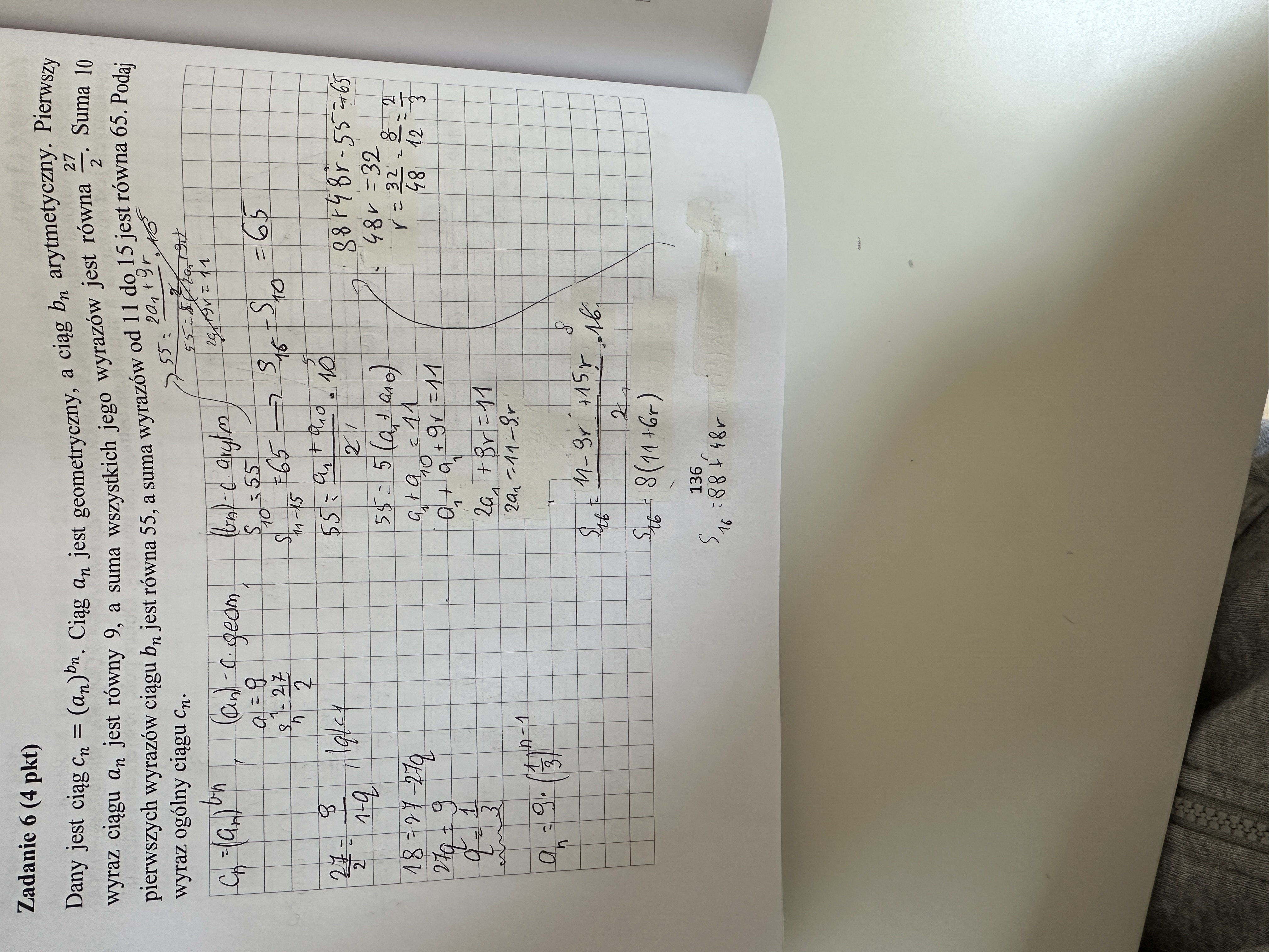 Mam problem z ciągiem bn (omyłkowo w zadaniu zapisywałam a zamiast b). Wychodzi mi inny pierwszy wyraz oraz różnica niż w odpowiedziach, ale nie widzę błędu.