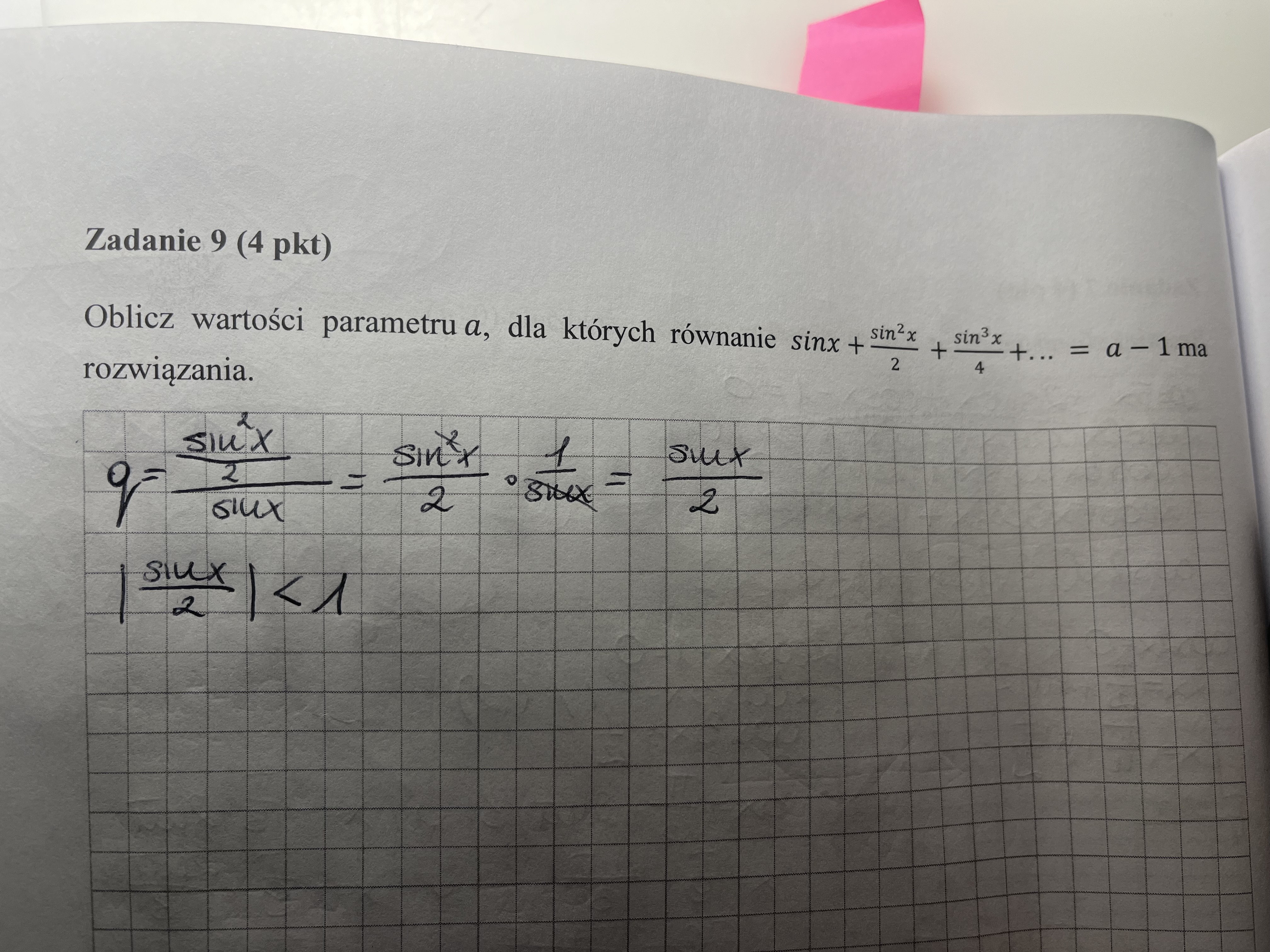 Znajdujesz zbiór wartości lewej strony równania, porównujesz z „a - 1”