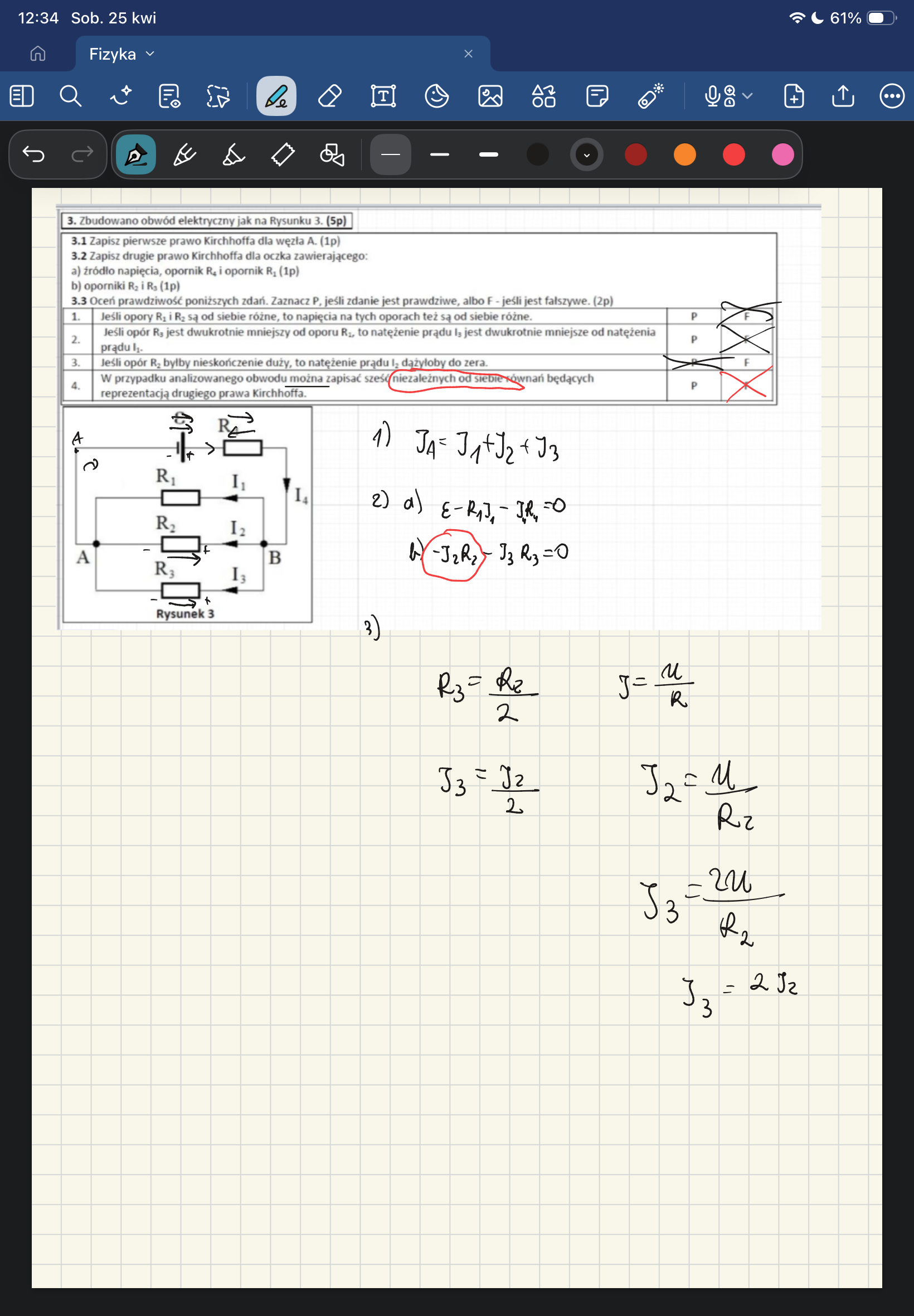 Czy ktoś wytłumaczy mi podpunkt drugi b? Dlaczego I2R2 powinno być z plusem? czemu różnica potencjałów na oporniku R2 ma inny zwrot niż R3?