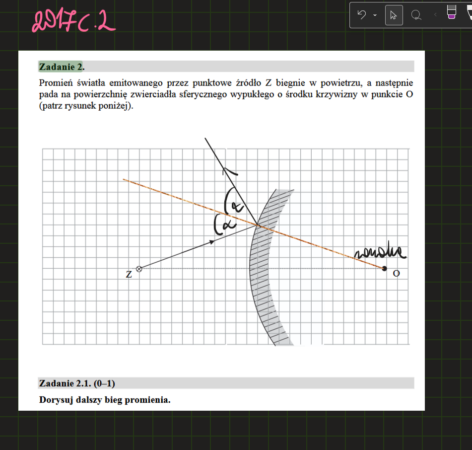 tutaj przedłużenia tego odbitego promienia nie mógłbym puścić przez ognisko tylko dlatego że oryginalny promień nie leci równoległe do osi optycznej, prawda?