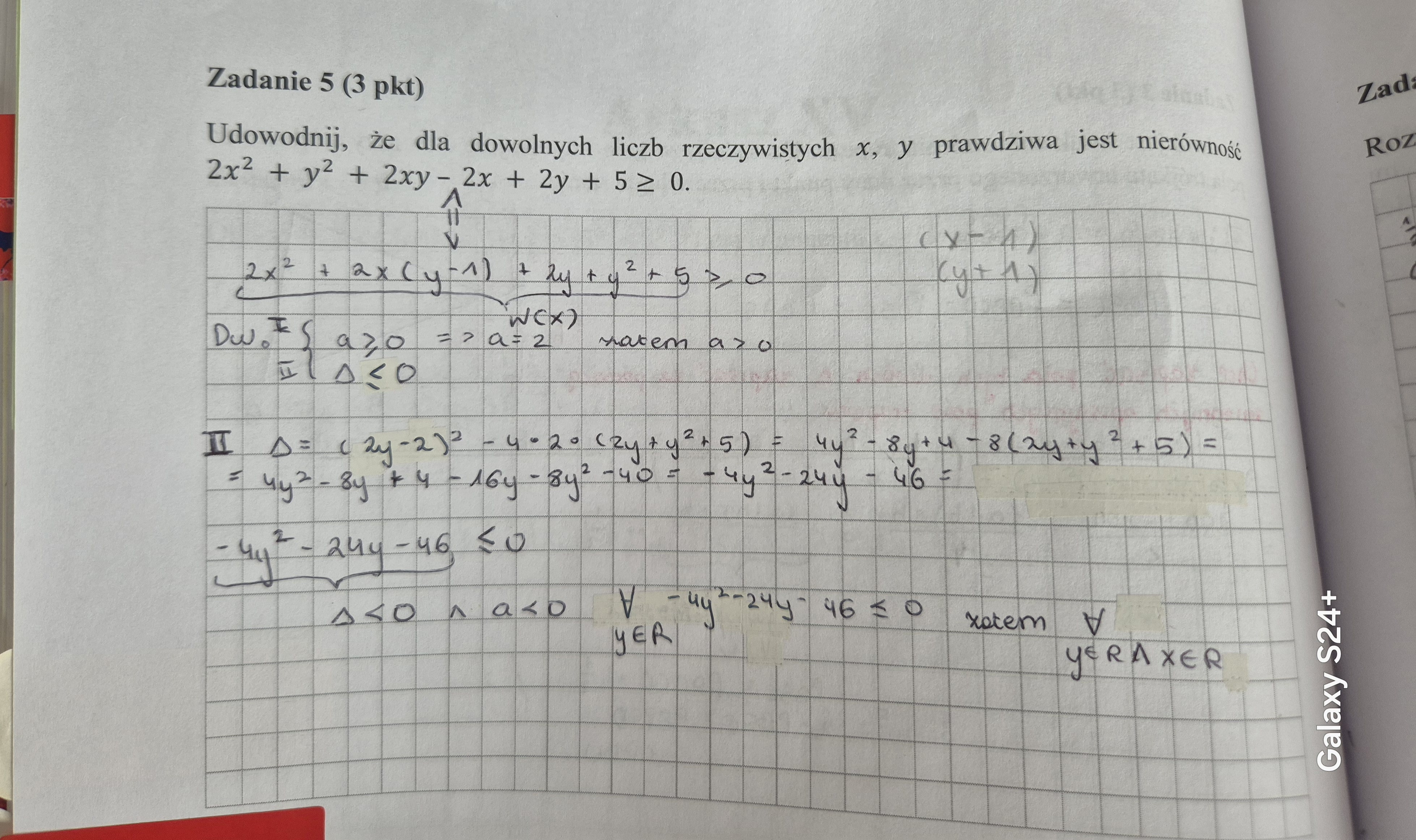 Mam pytanie, ponieważ my tutaj mamy udowodnić ze to wyrażenie jest większe bądź równe zero ti czy ja mam w warunkach dać ze delta ma być mniejsza bądź rowna zero, xzy tylko mniejsza? Bo ni wychodzi ze jest mniejsza i już nie wiem co się nie zgadza