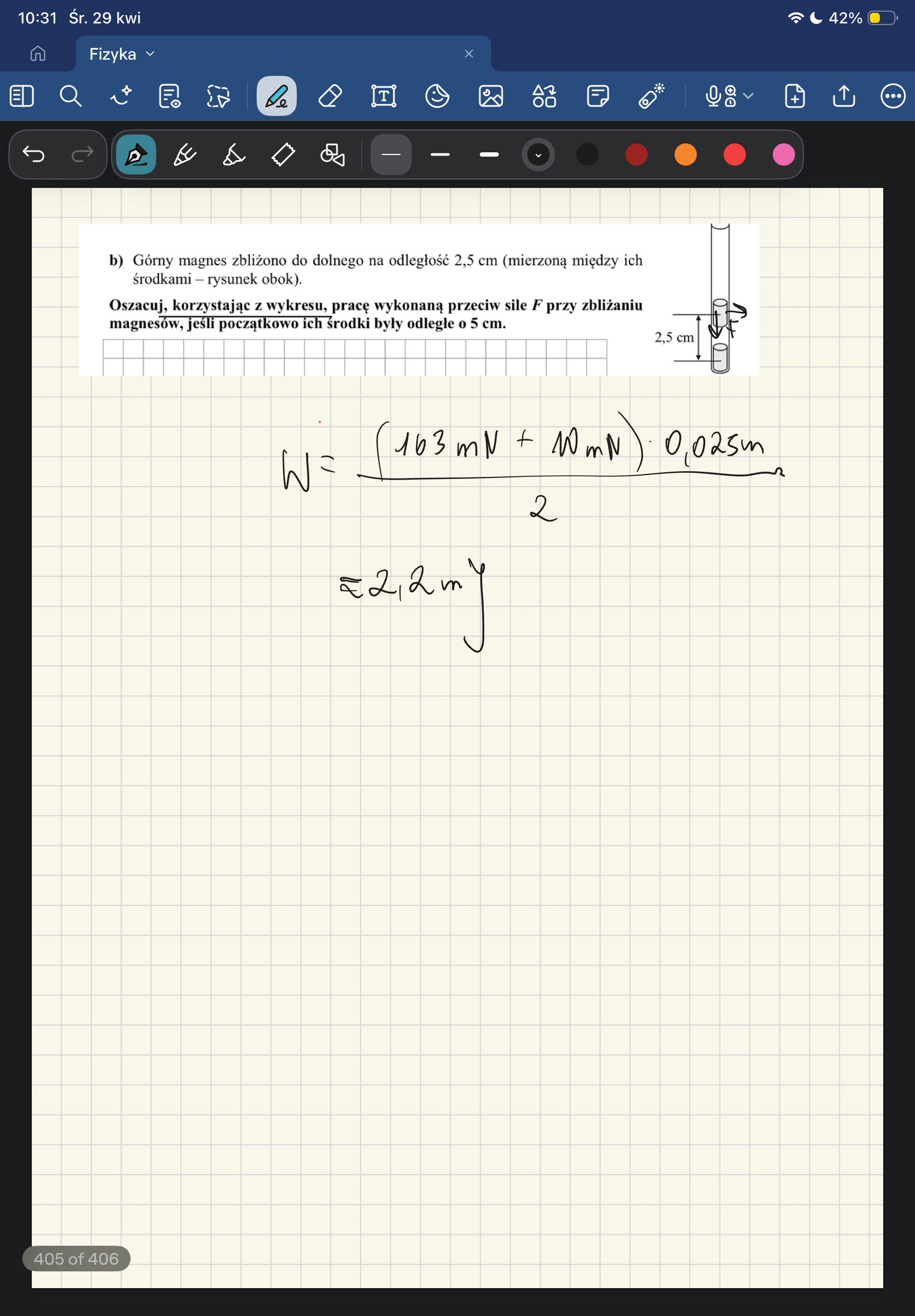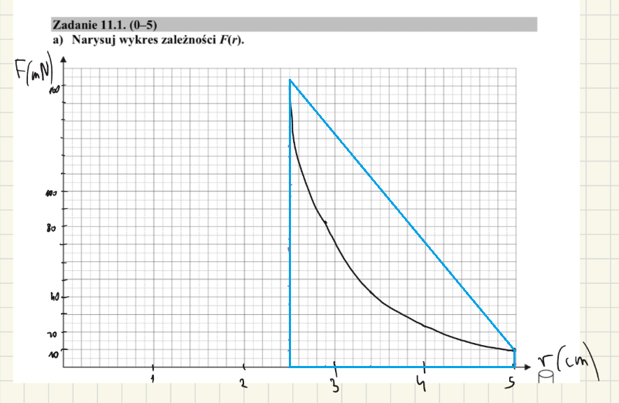 Licząc tę pracę w ten sposób, szacujesz ją jako pole trapezu, który wygląda tak jak zamieszczam to na poniższym rysunku. Więc jednak dość mocno przeszacowujesz w ten sposób tę pracę. Dokładniejsze byłoby zatem chociażby np. podzielenie tej figury pod wykresem na np. kilka mniejszych trapezów.